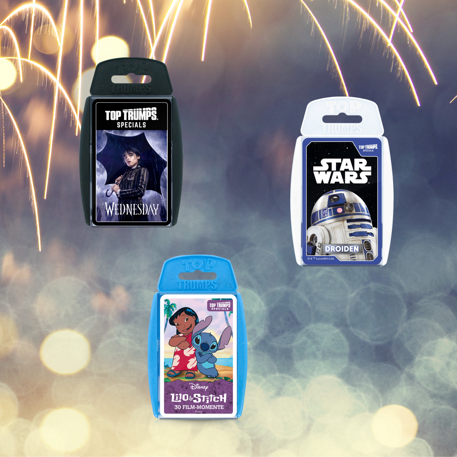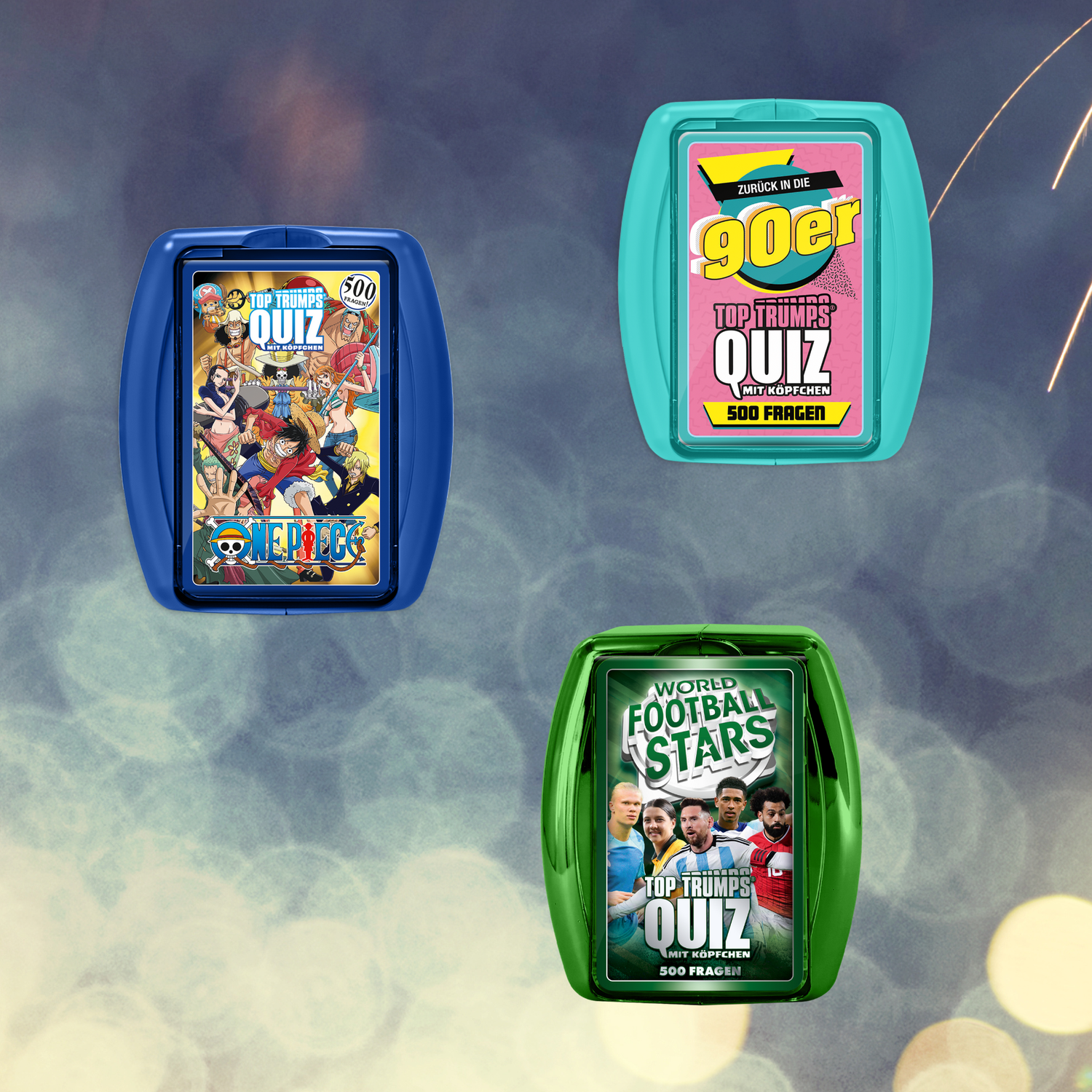 Ob Filmklassiker, berühmte Persönlichkeiten oder fantastische Welten – mit den unterschiedlichen Top Trumps Quiz-Editionen testest du dein Wissen auf spielerische Weise. Über 500 Fragen pro Set sorgen für fesselnde Duelle, überraschende Fakten und jede Menge Spaß für Groß und Klein.
