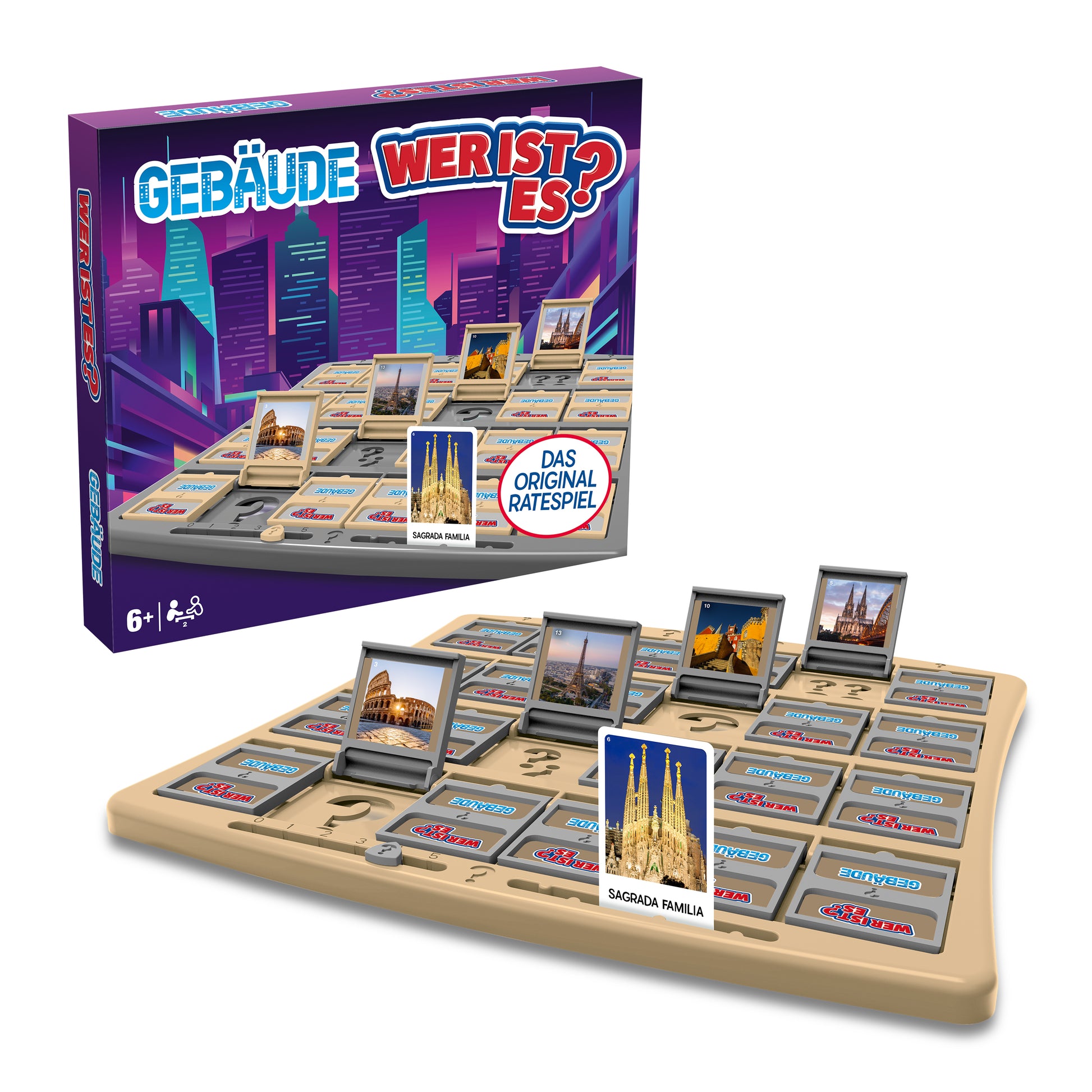 Spieler ziehen eine Gebäude Karte und versuchen durch clevere Ja/Nein- Fragen das versteckte Bauwerk zu erraten